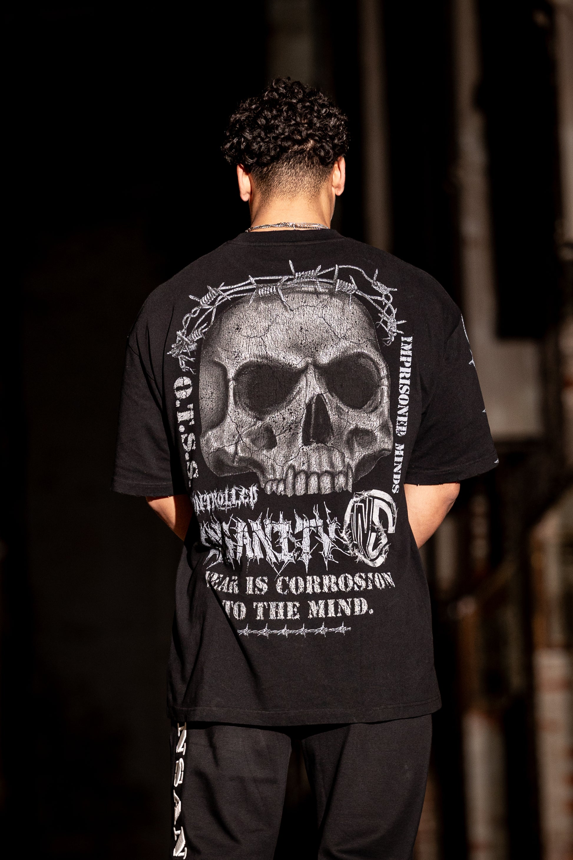 Unleash your inner strength with the Corrosion Skull Tee from our Imprisoned Minds collection. This bold graphic tee features a striking design of a skull crowned with a halo-like barbed wire, symbolizing the eternal battle between confinement and liberation. The words OTSS (Only the Strong Survive) stand as a defiant reminder that resilience is the key to breaking free from the mental chains that bind us. Fear is Corrosion to the Mind challenges you to confront your fears head-on and rise above them, unbroken and unstoppable.